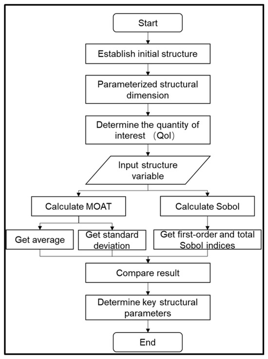 To identify the structural parameters that significantly influence the quantity of interest (QoI), the Morris One-At-a-Time (MOAT) method and the Sobol method are used to analyze the core structural parameters of the mirror, followed by comparison and evaluation. The computed values represent the extent of influence of each parameter on the QoI. The sensitivity analysis process is shown in Figure 4.
