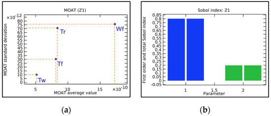 For the MOAT method, the average value represents the interaction between the parameter and the QoI, with larger values indicating a greater influence on the QoI. The standard deviation indicates the interaction between the parameter and other parameters or non-linear effects on QoI. A larger standard deviation suggests more complex influencing factors. Taking the maximum displacement point Z1 on the mirror surface as the quantity of interest, we assume that the parameters used for screening the study are normally distributed around their nominal values. Four parameters that are most likely to affect structural stiffness are selected, namely Tw, Tr, Tf, and Wf. The calculations yield results as shown in Figure 5a. It can be observed that among the selected structural parameters, Wf and Tr have relatively large values. Therefore, the width of the flanging and the thickness of the rib are the primary factors affecting structural stiffness and mirror deformation.