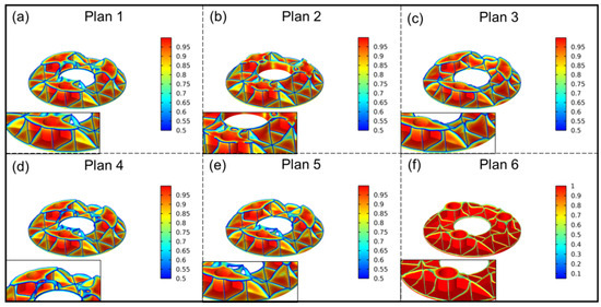 The results of the topology optimization are shown in Figure 7. After comparing and analyzing six different optimization plans, the following trends can be observed. Despite differences in objective functions and constraints, the overall trend of topology optimization is similar. Most of the material in the central hole area is removed, forming an arch bridge shape or completely removed (except for the retention of the central hole in Plan 2). The flanging is no longer a semi-closed rectangular structure but forms an approximately elliptical bottom plate at the support holes. It envelops the rib layout nearby, providing connection and support. Most of the material in the outer wall is removed, which aligns with the optimization expectations. This is because the outer wall has little effect on improving the rigidity or surface quality of the mirror and may even reduce the corresponding values. Similar studies have been conducted by other researchers as well [29,30,31]. The original shape of the rib is rectangular, but after iterative optimization of each scheme, it tends towards a triangular shape or is completely removed. A notable feature is that all plans retain three similar reinforcing ribs. These ribs pass through the dimensional holes and form a triangular shape near the edges at a 60° angle to each other. These three reinforcing ribs serve as the core structure to resist the deformation caused by the mirror’s own weight, acting as “load-bearing walls”, as shown in the magnified image in Figure 7a.