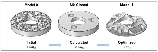 The core objective of mirror optimization is to ensure surface quality while achieving a light weight. In other words, the aim is to maximize the mirror’s stiffness and minimize deformation caused by its own weight and external loads. Through the key structural sensitivity analysis in Section 2.2, the critical parameters influencing the mirror’s structural performance were identified as the thickness of the ribs (Tr) and the width of the flanging (Wf). As can be seen from the initial structure (named Model 0), these main structures are interconnected, regular in shape, and redundant in volume. These parts should be used as design domains, as illustrated in Figure 6. Topological optimization is used to find out which materials should be retained and which materials have no obvious positive effect on performance and should be eliminated. Considering that the flanging width of Model 0 is narrow and the volume of the region is small, it may not yield ideal results. Therefore, before optimization, the width of the flanging is increased until the back is completely closed. Topology optimization is then performed, resulting in a more reasonable distribution of materials [22]. As shown in Figure 6, this configuration is named M0-Closed.
