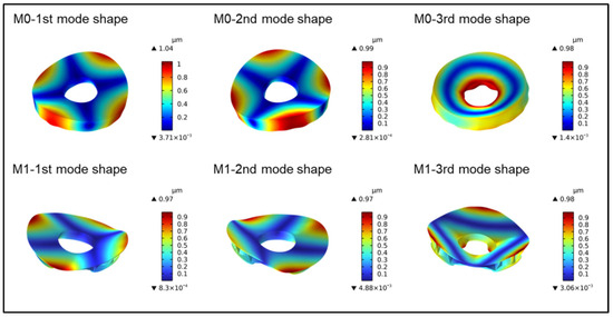By calculating the first 12 natural frequencies of Model 0 and Model 1 and removing the first 6 rigid body modes, the 7th natural frequency represents the first mode frequency. The frequency values of the first three orders for Model 0 and Model 1 are shown in Figure 9, where the natural frequency of Model 1 is 716.84 Hz. Comparing the first three modes of vibration for both models, it is evident that Model 1 exhibits similar deformation patterns in the first three modes, all bending inward on the mirror surface. However, for Model 0, starting from the third mode, there is a notable change in the deformation pattern, especially near the central aperture. This comparison indicates that Model 1, after optimization, exhibits more consistent and uniform deformation under external excitation, with reduced deformation during resonance compared to Model 0. Additionally, with a first natural frequency of 716.84 Hz, Model 1 demonstrates excellent stiffness and is less prone to low-frequency resonance.
