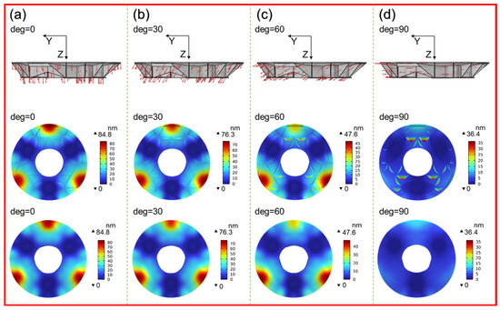 where Gx, Gy, and Gz represent the X, Y, and Z components of the gravitational acceleration, respectively. G is the gravitational acceleration constant, taken as 9.80 m/s2. θ is the angle between the optical axis and the ground. The deformation of M1 under different gravity field conditions is shown in Figure 10. The first row illustrates the direction of the forces acting on the mirror at different angles. The second and third rows show the deformation of the mirror’s back ribs and the mirror surface deformation, respectively, at different angles. When θ is 0 degrees, the optical axis of the mirror points to the zenith. At this time, the mirror deformation is greatest under the action of gravity. And at the edge between the support holes, local displacement will be too large. And as the mirror rotates, it is equivalent to the mirror not moving while the gravity field rotates. The overall deformation of the mirror reaches a minimum when it reaches 90 degrees.