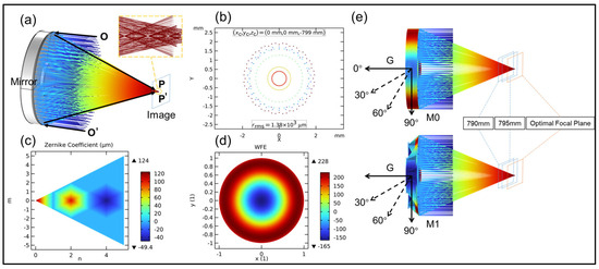 Opto-mechanical coupling of the mirror. (a) Ray tracing physical model; (b) spot diagram on the image plane; (c) Zernike coefficients on the image plane; (d) wavefront error; (e) imaging of M0 and M1 in different image planes under the influence of gravity.