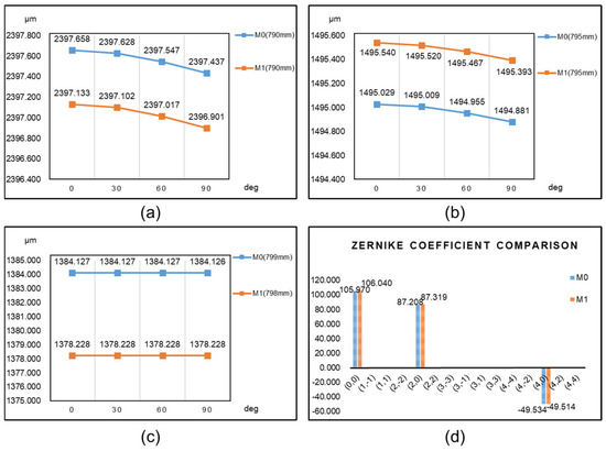 From the comparison results in Figure 12, it can be observed that there is no significant difference in the spot diagram radius () between M0 and M1 at the non-optimal focal planes of 790 mm and 795 mm. They are nearly equal. However, at their respective best focal planes, the of M1 is significantly superior to that of M0. In each angle scenario, the is reduced by approximately 6 μm, indicating an improvement in both mechanical and optical imaging aspects for the optimized structure M1. The Zernike coefficient comparison in Figure 12d shows that the variations in the aberrations fitted by the two mirrors’ imaging are minor, with the defocus and spherical aberration terms still predominant.