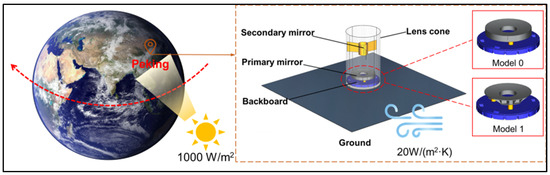 This section of the study starts from the actual environment, constructing a realistic physical environment. Combining the weather conditions of a certain place on a certain day (assumed to be sunny with no clouds), the mirror and its optical components are placed under sunlight, and the temperature changes with time. The simulation considers various factors such as gravity, air temperature, air convection, solar radiation, solid heat transfer between components, and the effect of diffuse reflection. The physical boundary conditions affecting the mirror are shown in Figure 13. The position of solar radiation is determined based on the actual geographical location. It is set to place the model in Peking, China (longitude 115.7°E, latitude 39.4°N). The local date is July 1, 2022. The solar irradiance is set to 1000 W/m2. The initial temperature of the optical system is set at 293.15 K. The heat transfer coefficient for external air convection is 20 W/(m2·K). To simulate the local temperature, the average environmental temperature is set to 300.15 K. The temperature function is as follows: