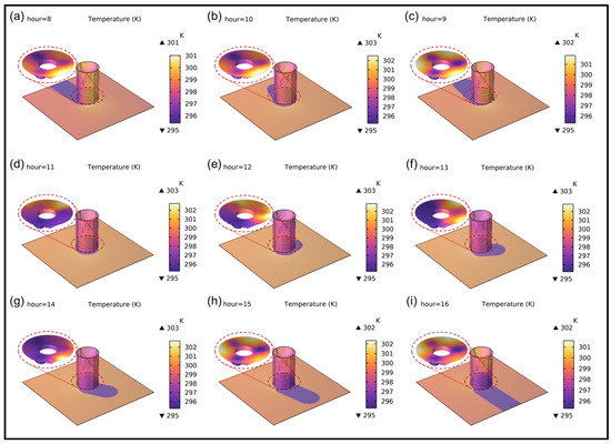 Temperature distribution of the optical system at different time intervals. (a) 8:00; (b) 9:00; (c) 10:00; (d) 11:00; (e) 12:00; (f) 13:00; (g) 14:00; (h) 15:00; (i) 16:00.