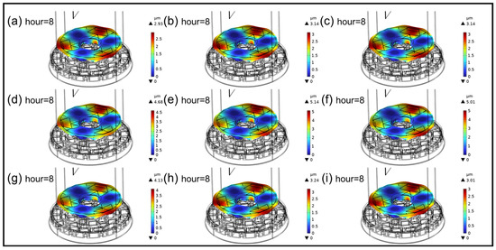 Mechanical–thermal coupling deformation of the primary mirror at different time intervals. (a) 8:00; (b) 9:00; (c) 10:00; (d) 11:00; (e) 12:00; (f) 13:00; (g) 14:00; (h) 15:00; (i) 16:00.