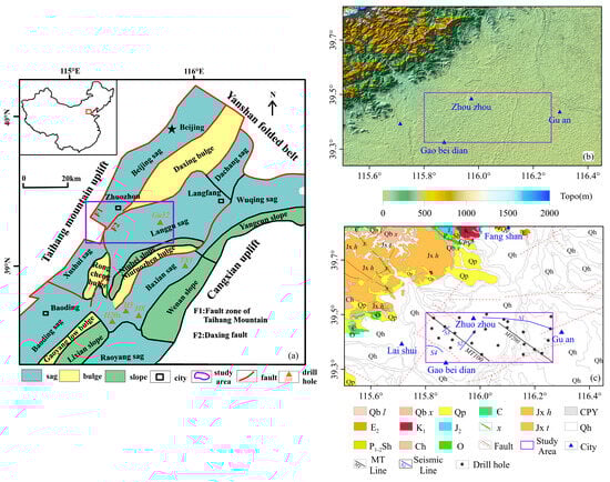 Background of the study area. (a) Structural background of the Jizhong Depression (modified from []). (b) DEM of the study area. (c) Geological map of the study area. (The geological map is sourced from the China Geological Survey, Geological Cloud Platform, Basic Geological Database.)