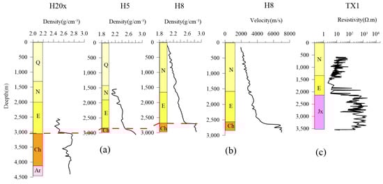 The geological structural units in the Jizhong Depression have experienced the same geological process. Therefore, the physical characteristics of the strata are consistent. We collected density, acoustic, and resistivity logging data from several boreholes (see Figure 1a for well locations) in the adjacent study area as physical property references to study the physical properties of underground media. The density and wave velocity data were from the North China Plain oil logging [], and the resistivity data were from the geothermal borehole logging in the new area of Xiongan. From Figure 2a, it can be seen that the density of the strata increases with the depth; that is, the density and depth of the strata basically have a positive correlation. The density difference between the Cenozoic strata and the underlying strata between different boreholes is significant and relatively stable, which is the main density interface. The variation in wave velocity has a similar morphology to the density of the strata (Figure 2b). The resistivity characteristics are relatively complex. From Figure 2c, it can be seen that the resistivity in the Cenozoic is low (especially in E layer). After entering the Paleozoic, the resistivity suddenly increases by two orders of magnitude, which is characterized by high resistivity. It is worth noting that the resistivity in the Cenozoic decreases with depth, which may be related to the high shale content in the Tertiary strata. The logging results show significant differences in density, wave velocity, and resistivity between the Quaternary and Tertiary, as well as the Tertiary and Paleozoic interfaces, providing a good prerequisite for geophysical exploration.