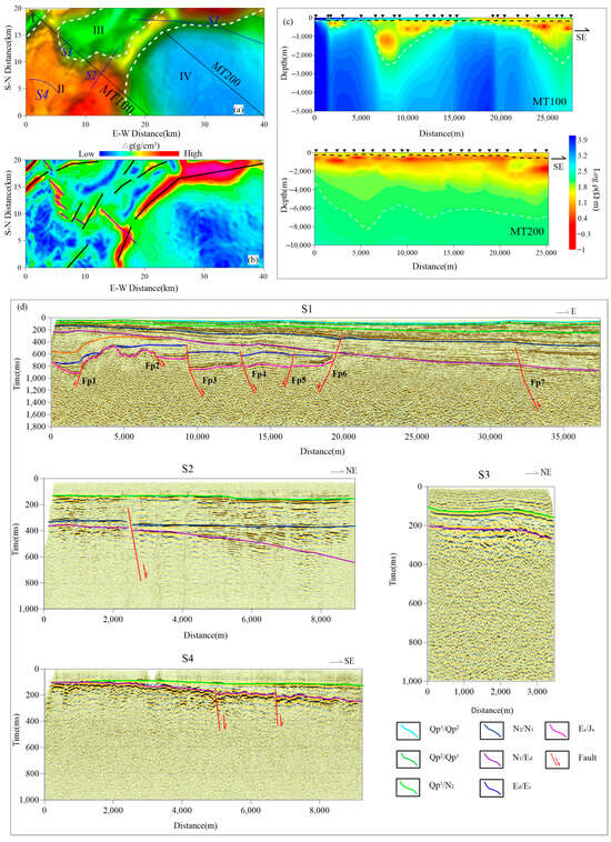 Comprehensive geophysical interpretation map. (a) Bouguer gravity anomaly map. (b) Bouguer gravity horizontal gradient model. (c) Two-dimensional (2D) inversion resistivity profiles of MT100 and MT200. (d) S1, S2, S3, S4 are reflection seismic time profiles.