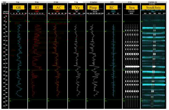 The seismic data acquisition used Sercel 428XL. The instrument recorded data from 2000 channels. The P-wave receiver adopts the EST-20dx series 60 Hz detector string. The excitation source uses the T15000 vibrator produced by IVI company for excitation with a 6000 pound force output and a broadband 10–550 Hz high-frequency output. In our study, the main detection targets of shallow seismic are the middle and shallow structures of sedimentary layers, fault attributes and BGA highly abnormal basement morphology. A total of four shallow seismic profiles are deployed, including the NE strike S2, S3 and WE strike S1 and S4 profiles (Figure 3c), which are more than 40 km in total. It mainly covers the key areas, especially the boundary between the bulge and the sag, as well as the speculated Songlindian fault (Figure 1c), which can provide basic data for the inversion of the bedrock surface and regional stability evaluation. In order to obtain accurate formation wave velocity, in seismic data processing, we use acoustic logging data and seismic wavelet convolution to generate synthetic seismic records [], and then we compare them with seismic channels near the well. The seismic reflection layer is precisely calibrated by geological layers. Figure 4 is the QGJ01 borehole logging curve and geological horizon calibration map. Through processing and inversion, we have obtained the time section and interpreted the reflected wave group on each section according to the wave group strength, continuity and geological data.