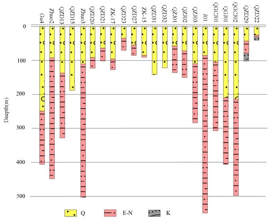 Drilling is the most powerful tool for directly and accurately revealing the thickness and lithology of sedimentary layers. The eastern part of the research area (BGA low value anomaly area) is located in the Langgu Sag, which is a favorable area for oil exploration. Therefore, there is a lot of drilling work in this area, and the deep geological information in this area is complete. However, the western part of the research area is close to the uplift zone, where there is little geological drilling work and basically a blank space. The drilling data mainly come from this research work. These boreholes are evenly distributed throughout the study area, some of which were obtained from previous hydrogeological work. Its location distribution is shown in Figure 1c. The depth of the geological interface is shown in Figure 5.
