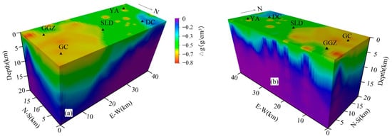 Three-dimensional (3D) density difference model of study area. (a) Northeast perspective. (b) Southeast perspective. Abbreviations: Songlindian (SLD), Gongcun (GC), Yian (YA), Gaoguan-zhuang (GGZ), Dongchengfang (DC).