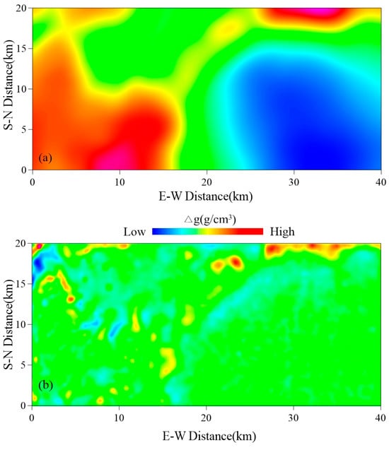 Among them, is the density difference, is the surface density difference, is the depth, and is the density changes with the depth factor. The least square fitting method is used to obtain the and , and then the data grid is used to obtain the sum of the whole study area’s and . Using the combination of the sum of the points, we obtain the 3D variable density model of the study area (Figure 6).
