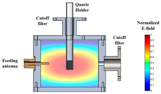 The procedure was carried out in a MW reactor based on a microwave cylindrical cavity (104.92 mm in diameter, 85 mm in height) designed to heat material samples of 10 mm diameter and 15 mm height placed inside a quartz tube container. A feeding antenna couples the TE111 transverse electric microwave mode in the MW reactor around the specific ISM (Industrial, Scientific, and Medical) frequency of 2.45 GHz. Figure 2 presents the normalized distribution of the electric field calculated with the commercial 3D electromagnetic simulator Quickwave (QWED, Warsaw, Poland). As illustrated in the figure, this mode presents a configuration of electric field maximum and uniform in the centre of the cavity, where the sample is placed, ensuring that the material is uniformly irradiated and preventing thermal gradients or the formation of hot spots that could lead to inaccuracies in the temperature determination. The cavity has open accesses in the upper and lateral walls with cutoff filters to avoid microwave leakage to allow the insertion of the quartz tube containing the sample, image recording, and temperature monitoring. Since we are dealing with high-emissivity materials and narrow measurement areas generated by the focal lengths of the lenses of the pyrometers, parasite reflections possibly caused by polished metallic walls can be neglected.
