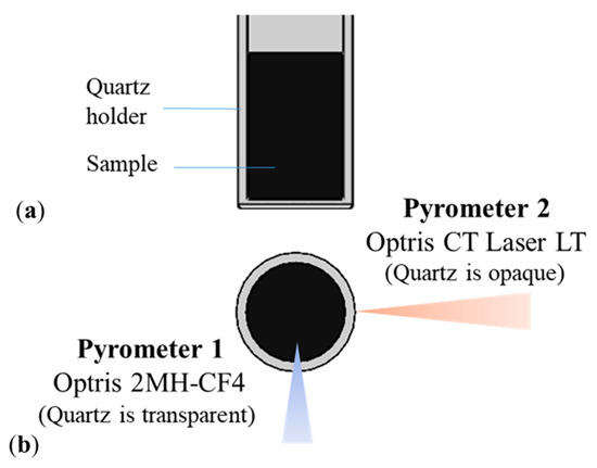 Experimental test setup: material to be characterized in the quartz holder with two pyrometers to which quartz is transparent or opaque, (a) top and (b) frontal views.
