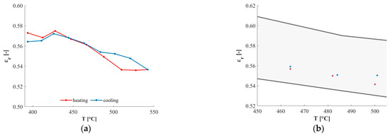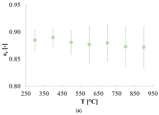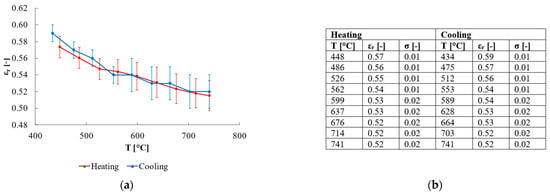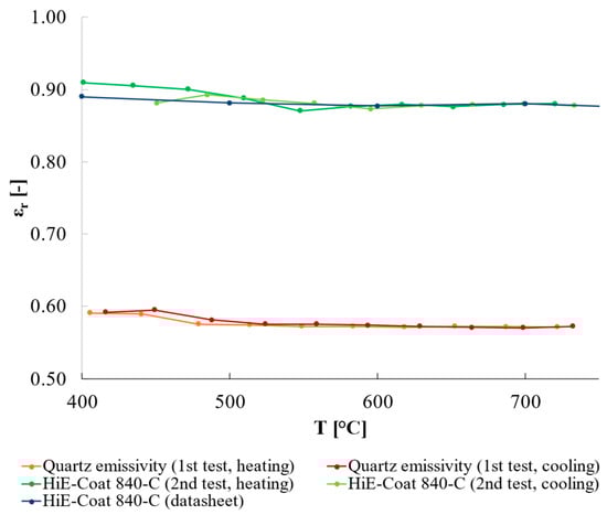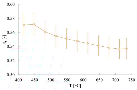 The estimated relative emissivity of quartz is reported in Figure 7. Its variations are quite limited, with values passing from ≈0.57 at ≈450 °C to ≈0.54 at ≈740 °C. The variability among tests is quite low, with standard deviation values < 0.01 whatever temperature is considered.
