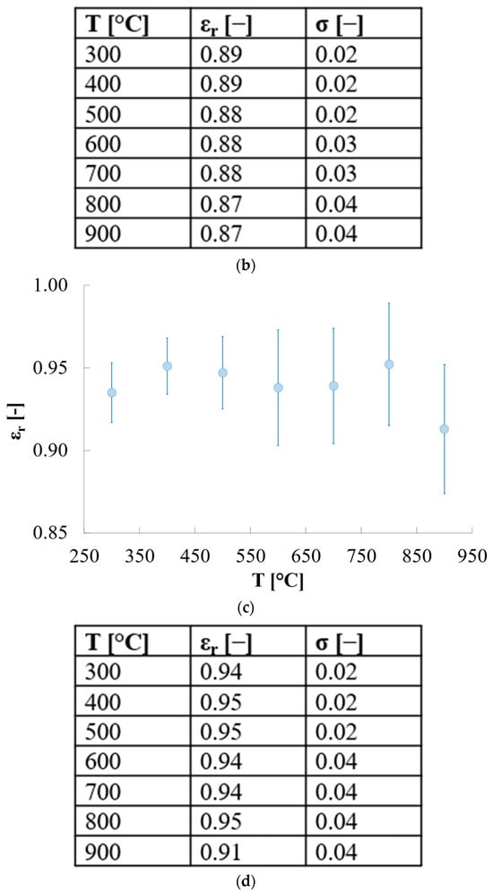 The HiE-Coat 840-C paint (AREMCO, Valley Cottage, NY, USA) was used as the reference paint, whereas the paint HIE-Coat 840-CM paint (AREMCO, Valley Cottage, NY, USA) was used for the validation phase. Their emissivity values are provided by the manufacturer for different temperature values together with the associated standard deviation (Figure 4). These coatings are considered as references for emissivity measurements and commonly used in the literature related to emissivity-determination procedures [18]. Prior to measurements, both paints were poured into the quartz holder and cured following the manufacturer procedure. The curing of HiE-Coat 840-C was accomplished by air-drying at room temperature for 1 h, then heating for 1 h at 95 °C. HiE-Coat 840-CM was air-dried at room temperature for 1 h, then heated for 30 min at 95 °C and 1 h at 260 °C.