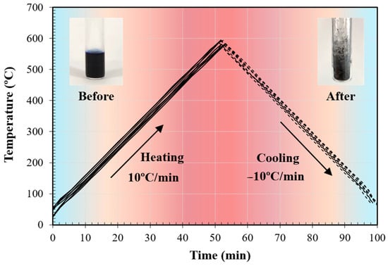 Figure 5 represents typical temperature curves during several heating and cooling cycles (approximate rate: ±10 °C/min), with a picture of the reference paint sample inside the quartz holder before and after a set of experiments. It can be noticed that part of the solvent evaporates after the first heating/cooling cycles, confirming that these thermal processes would slightly affect its characteristics if only a few cycles were performed [27].