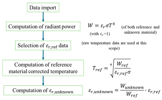 The proposed approach grounds on the hypothesis that when two materials, which are monitored through heat radiation-based non-contact approaches, reach thermal equilibrium, the raw data provided by the instruments are related to the temperature as per their radiated power, which is indeed emissivity-dependent.