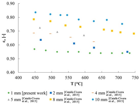 These results are in line with what is expected from literature. In fact, Petrov and Reznik [31] report a quartz relative emissivity of ≈0.64 at ≈700 K (i.e., ≈427 °C), decreasing until 0.41 at 1300 K (i.e., ≈1027 °C) if a thickness of 2 mm is considered. On another hand, with a thickness of 4 mm they obtained a relative emissivity of ≈0.69 at 700 K, decreasing until ≈0.458 at 1300 K. Assuming that the lower the thickness the lower the relative emissivity, the results of the present study are compatible with those reported by Petrov and Reznik (Figure 8). The slightly different slope of the emissivity found with the proposed approach might be due to the different composition of the quartz holder with respect to the quartz samples used by Petrov and Reznik [31].