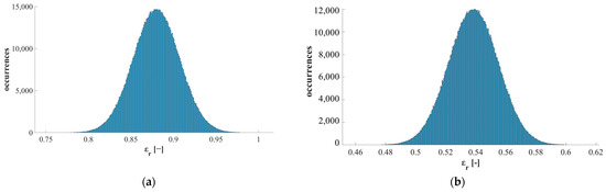 Probability distributions of the relative emissivity: (a) HiE-Coat 840-C paint used as reference in the first step of the proposed approach (i.e., input for the estimation of quartz emissivity)—working temperature: 599 °C (heating data considered); (b) quartz estimated in the first step of the proposed approach (i.e., output of the measurement pipeline)—working temperature: 599 °C.