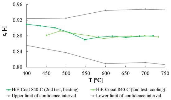 Concerning the further validation test on HiE-Coat 840-C, the results are reported in Figure 12; the quartz emissivity was estimated from a heating/cooling cycle where the high-emissivity paint (i.e., HiE-Coat 840-C) was used as a reference (i.e., step 4 in Table 1), whereas in the following test, quartz was considered as the reference material and the emissivity of HiE-Coat 840-C was derived consequently (i.e., step 5 in Table 1). As clearly seen in Figure 13 (expanded uncertainty, k = 2, is reported), the results obtained fall in the uncertainty band estimated considering the manufacturer data.