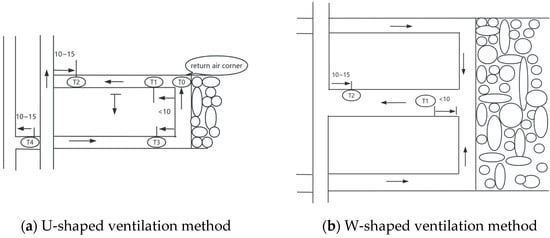 The longwall coal mining face sensors are arranged according to this figure. In the U-shaped ventilation method, a methane sensor T0 is set at the return air corner (less than 1 m from the cut roof line); a methane sensor T1 is set at the working face; a methane sensor T2 is set in the return airway of the working face; in the coal and gas outburst mine, methane sensors T3 and T4 are set in the intake airway. When using series ventilation, a methane sensor T4 is set in the intake airway of the worked-on face, as shown in (a). The arrangement of methane sensors for the W-shaped ventilation form of the coal mining face follows the aforementioned regulations, as depicted in (b). (The units in this figure are in meters).