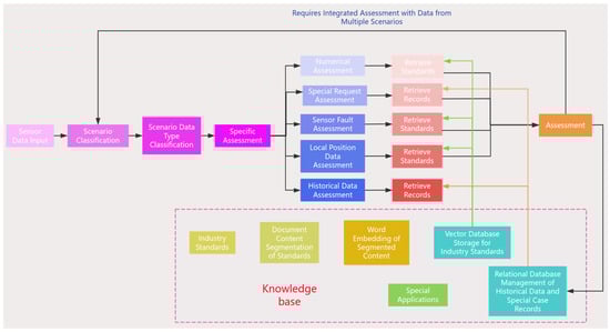 The minimum judgment unit conducts specific assessments based on the data it routes. The process primarily consists of two stages. The first stage is the data retrieval and comparison phase, where the sensor data are searched against a knowledge base to find the corresponding standard documents. These standard documents contain pre-set thresholds, ranges, patterns, or any other benchmarks used to determine the normalcy of the data. The second stage is the judgment phase, where, upon successfully retrieving the relevant standard documents, the minimum judgment unit begins an in-depth analysis of the sensor data, evaluating whether they exceed the pre-set thresholds or match any abnormal patterns. If the data points fall within the normal range, the system deems them to be in a normal state; conversely, if the data points are outside the range or match abnormal patterns, the system flags them as alarm data.