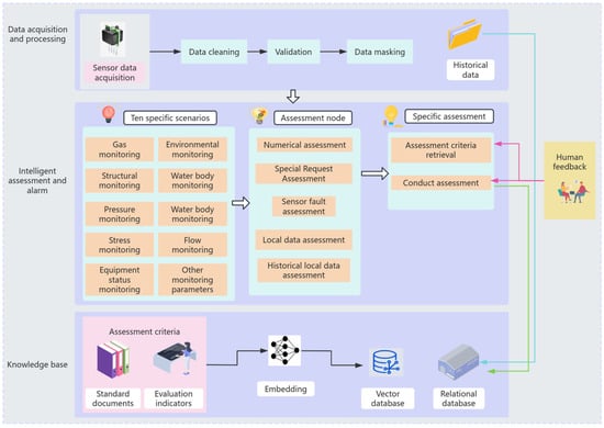 The design concept of the multi-level structure effectively enhances the system’s processing speed, accuracy, and stability, and achieves streamlined processing and specialized judgment. The powerful natural language understanding and reasoning capabilities of LLM provide the system with robust cognitive abilities, enabling it to effectively process multi-source sensor data and perform intelligent judgments. The combination of vector databases and relational databases, along with the application of RAG technology, greatly enhances the precision and applicability of the evaluation criteria and promotes the system’s utilization of historical experience. The human–machine interaction feedback mechanism ensures the system’s flexibility and adaptability and fosters continuous learning and optimization. The introduction of embodied intelligence allows the system to enhance its perception of environmental changes through physical interaction with the environment, and to realize more flexible and adaptive decision making.