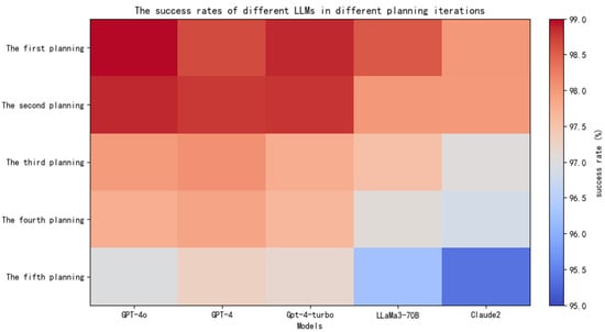 Figure 6 presents a heat map of path planning, where the color gradient indicates the success rate levels, with dark red representing high success rates and light blue indicating lower success rates. The color bar on the right shows the specific percentages ranging from 95% to 99%. As illustrated in the figure, the first path planning achieved the highest success rate, at 98.97%. Although the success rate of the second planning stage showed a slight decrease, it maintained a satisfactory level. The third planning stage demonstrated generally good performance. However, starting from the fourth planning stage, the success rates were notably lower, all falling below 96.5%. As the hierarchical structure deepened, the tasks became increasingly complex, leading to deviations in the system’s path-planning capabilities.