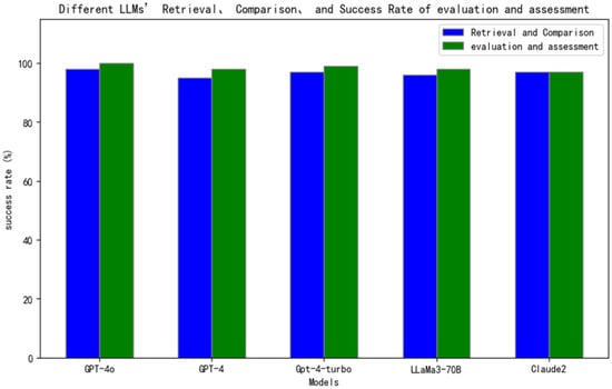 Figure 7 demonstrates that various models exhibited excellent performance in the retrieval and comparison phase. We conducted a comparative analysis of five models—GPT-4o, GPT-4, GPT-4-turbo, LLaMa3-70B, and Claude 2—evaluating their success rates in retrieval, comparison, and assessment tasks using identical datasets. Notably, GPT-4o demonstrated superior performance across all aspects, achieving a 100% success rate in assessment following successful standard retrieval. The other models also performed admirably in matching standards with data, maintaining overall success rates exceeding 95%. As illustrated in Figure 7, all models consistently showed slightly higher success rates in the “assessment” task compared to the “retrieval and comparison” task. This pattern can be attributed to the dependent relationship between assessment and retrieval–comparison processes; when the knowledge base is correctly retrieved, assessment results typically show minimal deviation. These two tasks are fundamentally complementary, and the full potential of LLMs can only be realized when both tasks achieve high levels of accuracy and efficiency.