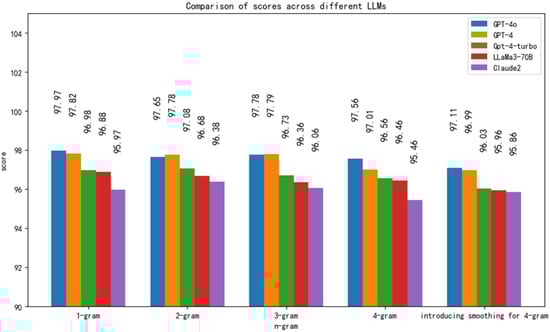The BLEU evaluation method has been widely used across various tasks, such as summarization and text translation. Notably, it achieved a score of 0.88 in evaluating translations generated by ChatGPT-4 [47,48]. As shown in Figure 10 of this paper, the BLEU scores of the GPT-4o model are generally higher than those of the GPT-4 model across all n-gram levels, indicating that the GPT-4o model exhibits better performance in terms of coherence and accuracy. At the 1-g level, the GPT-4o model scores slightly higher than the GPT-4 model, with a small difference. The success rates of GPT-4-turbo, LLaMa3-70B, and Claude2 decrease in sequence, but overall, they remain quite satisfactory. This suggests that all models show similar performances in the selection of individual words. At the 2-g level, the GPT-4o model’s score once again slightly exceeds the GPT-4 model, indicating a slight advantage of GPT-4o in generating more natural phrase or word combinations, while GPT-4-turbo, LLaMa3-70B, and Claude2 do not perform as well as GPT-4, but still meet the requirements. At the 3-g level, the GPT-4o model’s score is significantly higher than that of the GPT-4 model, demonstrating its superiority in constructing longer and more complex sentence structures. At the 4-g level, although the GPT-4o model’s raw BLEU score is lower than that of the GPT-4 model, after the introduction of a smoothing function, its score surpasses that of the GPT-4 model. The smoothing function avoids the situation where n-grams receive no score. In conclusion, the GPT-4o model shows better performance in most cases, particularly in its ability to construct complex sentences.