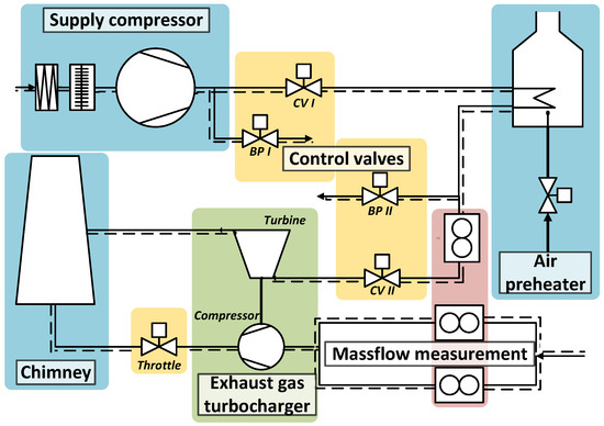 The experimental data used in this study for the development and validation of the proposed BTT evaluation procedure were acquired from a turbocharger test bench located at the Institute for Power Plant Technology, Steam and Gas Turbines of RWTH Aachen University [57]. In this test bench, a six-stage radial compressor provided air to the turbocharger turbine. To simulate the actual operating conditions of the radial turbine, the pressure of the supplied air was adjusted through a series of valves, while its temperature was regulated using a natural gas-fired heat exchanger. The turbocharger compressor drew air at atmospheric conditions, and its outlet pressure was set via a throttle valve. This configuration allowed the precise adjustment of the investigated operating point, enabling vibration measurements under real operating conditions. The test bench is illustrated in Figure 1. A detailed description can be found in previous publications [11,57].
