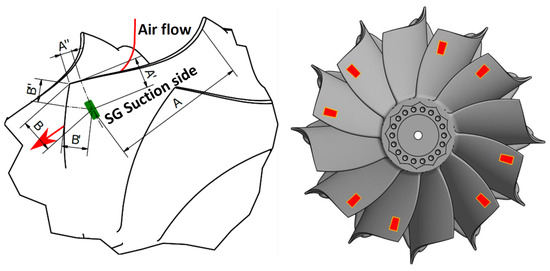 Position and orientation of SGs on blades (left) and SG distribution on the impeller (right).