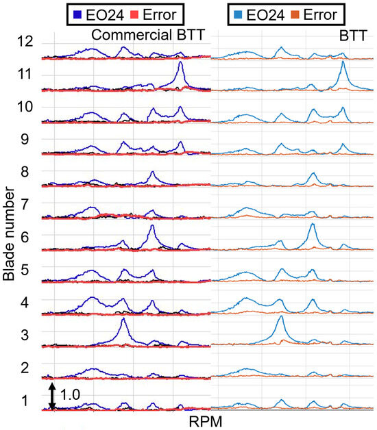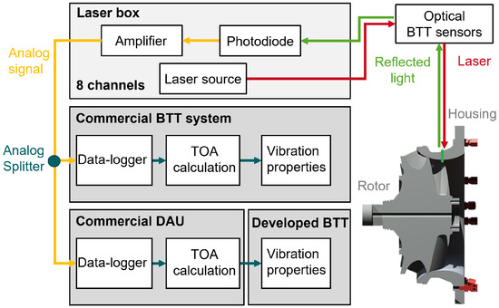 The raw analog signals of the BTT sensors were split and provided to both a commercial BTT system manufactured by Hood Technology and a commercial Data Acquisition Unit (DAU) from Prime Photonics. The TOAs used for the evaluation procedure proposed in this paper were acquired from the DAU of Prime Photonics, while the vibration properties determined by the SGs and the commercial BTT system were utilized for the comparison and validation of the presented methods. An illustration of the BTT measurement configuration is provided in Figure 3. A detailed description of the test bench and a comprehensive analysis of the vibration measurements can be found in previous publications [11,57].