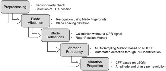 The proposed BTT processing sequence is divided in smaller blocks, which each performs a certain evaluation task. A workflow chart of the BTT evaluation procedure is presented in Figure 4. Initially the TOAs are formatted in a preprocessing block. After the preprocessing, blade identification must be performed. In this block, the TOAs are allocated among the impeller blades. Next, the blade deflections are calculated through the novel Rotor Position method, which will be thoroughly described in a following section. Both the blade allocation and the deflection calculation do not rely on an OPR signal. Afterwards, the vibration frequency can be reliably determined through the improved Multi-Sampling method, which is based on NUFFT approaches. Even though the proposed method can deliver a reliable assessment of the vibration frequency, an accurate estimation of the vibration properties is not possible. Therefore, it is necessary to employ other methods for the determination of the vibration amplitude and phase. For this reason, the vibration frequency is provided to a conventional CFF analysis, where the amplitude and phase of each blade are determined for each revolution. By estimating the vibration frequency, a user-defined frequency interval is no longer required, and the number of EOs that are evaluated by the CFF method is significantly reduced. As a result, an automated evaluation procedure is enabled, while parallel strain gauge measurements for frequency identification become obsolete.