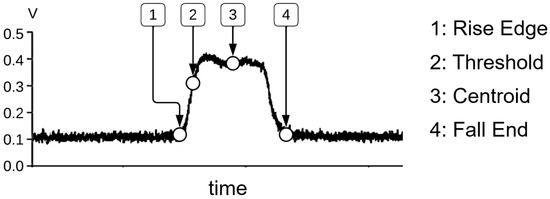The evaluation process begins with the acquisition of the TOAs of the blades. The TOAs are obtained using a commercial DAU from Prime Photonics. This DAU digitally calculates the TOAs, allowing determination at several positions along the voltage pulse generated when a blade passes in front of a BTT sensor. An exemplary voltage pulse is depicted in Figure 5. As shown, TOAs are determined for the following points: Rise Edge, Threshold, Centroid, and Fall End. The Rise Edge TOA corresponds to the beginning of the rising edge of the voltage pulse. The Threshold TOA is located along the rising edge, at a voltage value automatically adjusted by the system, e.g., at of the peak voltage. The Fall End TOA is positioned at the end of the falling edge of the signal. The Centroid TOA lies at the center of the voltage pulse and is defined by the mean time of all the points on the voltage pulse. From these positions, a specific TOA position must be selected for further evaluation.