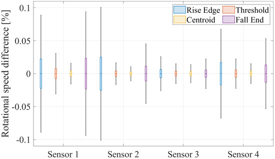 All these factors influence the rotor speed calculated from the TOA positions. Therefore, assessing the stability of a TOA position, i.e., the extent to which it is affected by these factors, can be effectively achieved by examining the rotor speed. To select a reliable TOA position, the stability of each TOA position is evaluated by analyzing the rotor speed within a speed range where no vibrations occur. For each TOA position, the rotor speed is calculated and subsequently compared to the average speed across all TOA positions. Figure 6 presents a boxplot diagram, which illustrates the differences between the speeds calculated from the individual TOA positions and the average speed for four exemplary sensors, at a rotational speed of approximately 30,700 RPM. This dataset contains TOA from more than 40,000 revolutions.