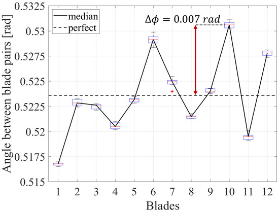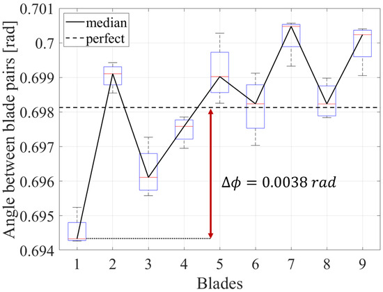 Figure 7 and Figure 8 illustrate the angle between the blade pairs for two different impellers. The black line indicates the median angle between the blade pairs over all BT sensors, while the boxes illustrate the variation range between the sensors. In addition, the black dashed line indicates the angle for a perfectly manufactured impeller, which has no blade spacing variations. A clear difference between the angle of adjacent blades can be observed, which leads to a distinctive fingerprint pattern of the impeller. As this pattern derives from the manufacturing tolerances, it is unique to each impeller. This fingerprint pattern can be used for blade identification. In this case, the blade with the smallest distance to the neighboring blade is defined as the first blade.