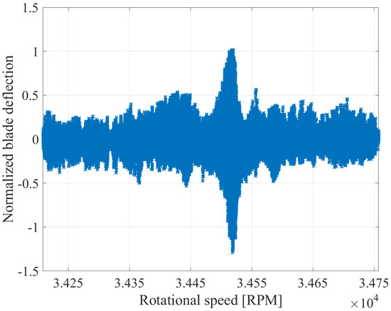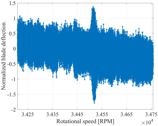 The removal of the static component is illustrated in Figure 9 and Figure 10 for an exemplary speed range, in which a vibration occurs. The figures display the deflections of a single blade at all sensors. The blade deflections, which contain the static component, are presented in Figure 9, while Figure 10 depicts only the dynamic deflections. Before the removal of the static component, the deflections oscillate around a positive value at the beginning of the recording. As the speed increases, the static component of the blades decreases. As a result, the deflections oscillate around zero at the middle of the recording, while at the end of the recording, they oscillate around a negative value. After the removal of the static component, the dynamic deflections fluctuate around zero regardless of the speed. Therefore, the hypothesis that the static component is proportional to the rotational speed is validated.