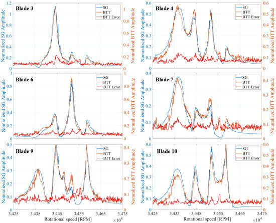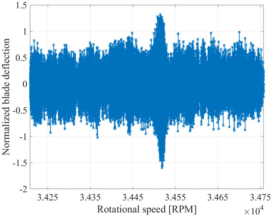 Recently, Fan Z. et al. [35] presented an improved Multiple-per-Revolution (MPR) method, which generates MPR signals by fitting the TOA data via the least-squares polynomial method. In this approach, the MPR signals, which serve as theoretical TOAs of non-vibrating blades, are derived under the assumption of a linear speed change within a revolution and consideration of the actual blade positions on the impeller. Wang W. et al. [36] addressed challenges during rapid speed changes using Savitzky–Golay filters (SGFs) for noise reduction and calculating the speed of each blade separately at each sensor. By establishing a model correlating the expected TOA with actual blade position, the blade deflection is calculated. Even though this method can improve the accuracy of BTT under speed fluctuations, the use of SGF can introduce false blade deflections due to fitting errors.