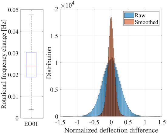 The noise reduction can be also illustrated by considering the difference between two consecutive dynamic deflections of a blade at a sensor. In the case of ideal measurement data, without considerable vibrations, the difference between two consecutive deflections should be close to zero. In addition, when synchronous vibrations occur, the difference between two consecutive dynamic deflections at a sensor should be minimal, assuming a minor rotational speed change and thus a small vibration magnitude difference. Hence, the difference between two consecutive dynamic deflections at a sensor can be used for noise assessment. To compare the noise between the raw and smoothed dynamic deflection, the distribution of the difference between two consecutive deflections at the same sensor for both datasets is presented in a histogram (Figure 12). Through the implemented smoothing, a substantial reduction in the deflection difference can be observed.