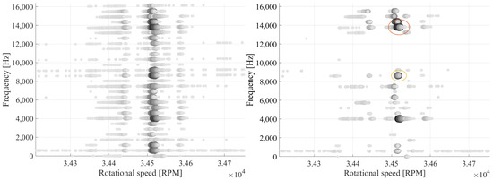 Initially, the rotational frequency of the rotor at each BTT sensor is calculated through the time difference of two consecutive TOAs of a blade as shown in Equation (2). This is performed for all blades, so that the query points of the rotational frequency in a revolution equals the number of blades.