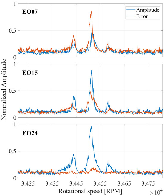 The boxplot diagram in Figure 12 presents the rotational frequency change during 10 revolutions for the speed region of the blade deflections presented in Figure 11. A minor frequency change of less than 0.05 Hz is observed, translating to a relative deviation of less than . Given that the relation between the excitation frequency change and the rotational frequency change is identical to the relation between the excitation frequency and the rotational frequency, the relative excitation frequency deviation of an EO is the same as the relative rotational frequency deviation. Therefore, the impact of the chosen window size on blade deflections should be negligible.
