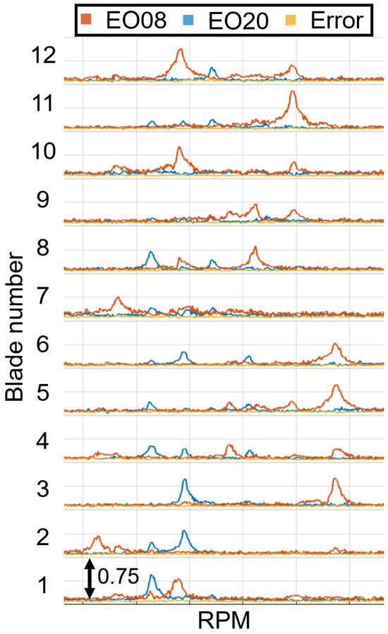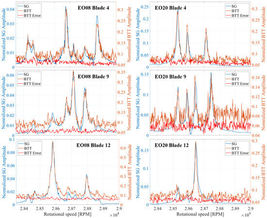 CFF determines the phase and amplitude of each EO along with an error term, which indicates how good the EO fits to the BTT data. The user must then identify the true EO based on the CFF results. In this aspect, there is always the possibility that the true EO lies outside of the frequency interval provided by the user. Moreover, EOs, which fit to the deflection signal due to the aliasing effect, can be incorrectly identified as the true EO due to their low error term. As a result, automated identification methods are prone to errors and significant user effort is required to correctly identify the true EO. For this reason, SGs are usually instrumented alongside BTT on some blades for the identification of vibration frequencies.