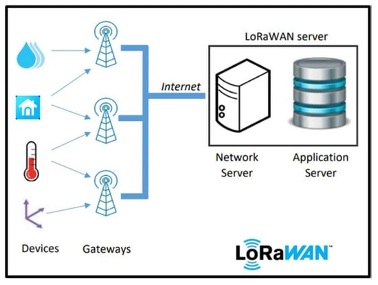 LoRaWAN (Long Range Wide Area Network) [73,74,75,76] Utilizes the physical modulation of LoRa technology, encoding and decoding the content of received and sent messages. Figure 1 shows the architecture of a LoRaWAN communication system [42,43], which includes the following: