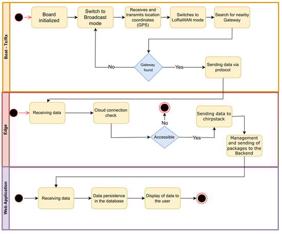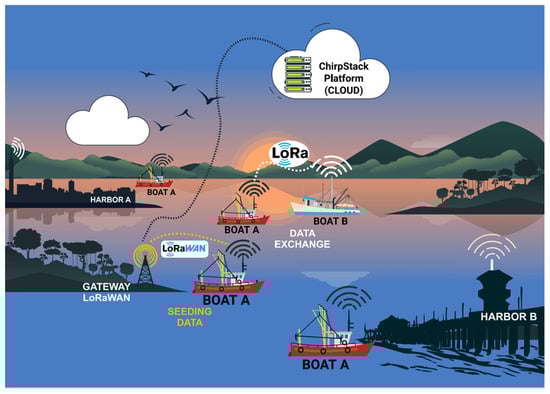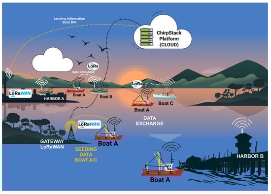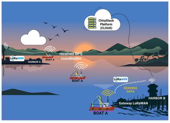 - Boat A leaves port A and, during the journey, receives its GPS position and stores it. Boat A makes a complete journey without encountering another boat. When it arrives at port B (destination port), it transmits all the data stored during the trip to the port B gateway with LoRaWAN, as shown in Figure 3.