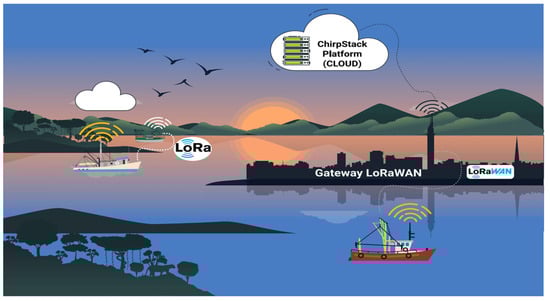 Parriet et al. [63] evaluated the communication link quality of a LoRaWAN network in a sea scenario. The two LoRaWAN gateways (receiving devices) installed on land on the property of the company Agroittica Toscana SRL contain receiving antennas located at a height of 13.2 m above sea level. The LoRaWAN Gateway model was the RAK831 LPWAN—RAKWireless [64], driven by a Raspberry Pi 3 model B. The end node (transmitting device) was placed on board a fixed boat on the high seas, with a pole to support the antenna. The measurements were taken with the transmitter antenna at two different heights: H1 = 3.5 m and H2 = 2.1 m above sea level. The STMicroelectronics B-L072Z-LRWAN1 kit was used [65]. The LoRa network configuration parameters were as follows: (a) packet size = 51 bytes; (b) frequency range = 868 MHz; (c) transmission band = 125 kHz; (d) code rate = 4/5; and (e) spread factor = 7–12 bits/s. A Yagi-Uda directional antenna was used [66] with a gain of 9 dBi. The test results show that efficient data transmission can be achieved over a distance of 8.33 km via the worst-case LoRaWAN network configurations in an industrial aquaculture plant scenario. In Table 1, we summarize the main characteristics of the present paper and the most similar related work according to the following aspects: scenario, vehicle, architecture, chip, technology, and approach.