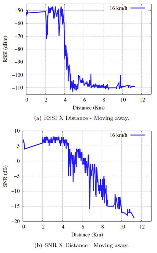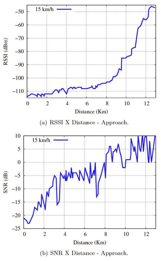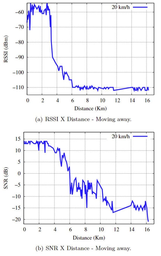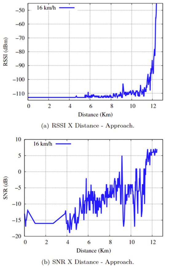 Santos et al. [32] evaluated the data transfer capacity of an ad hoc network consisting of a LoRa transmitter device mounted on a boat and a LoRa receiver device fixed at a riverside house. The boat moved away from and toward the riverside house at speeds of 10, 20, and 30 km/h. The configuration parameters of the LoRa network were as follows: (a) packet size = 54 bytes; (b) frequency band = 915 MHz; (c) transmission bandwidth = 500 kHz; (d) coding rate = 4/5; and (e) spreading factor = 7 bits/s. The results of practical experiments at speeds of 10, 20, and 30 km/h, in both the moving away and approaching scenarios, demonstrate that data transfer via LoRa technology is feasible, with a communication range of up to 1600 m and a contact time of 6 min.